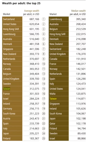 | 排名 | 國家 / 地區 | 中位數 ÷ 平均數 |