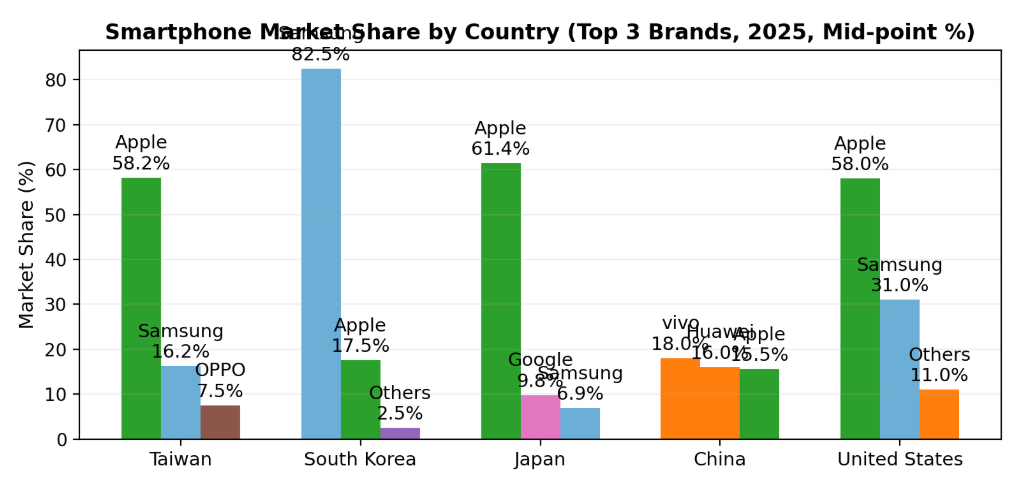 台灣令人驚訝的是oppo竟然排第3,可是我身邊沒人用這個牌子(同溫層謬誤?)