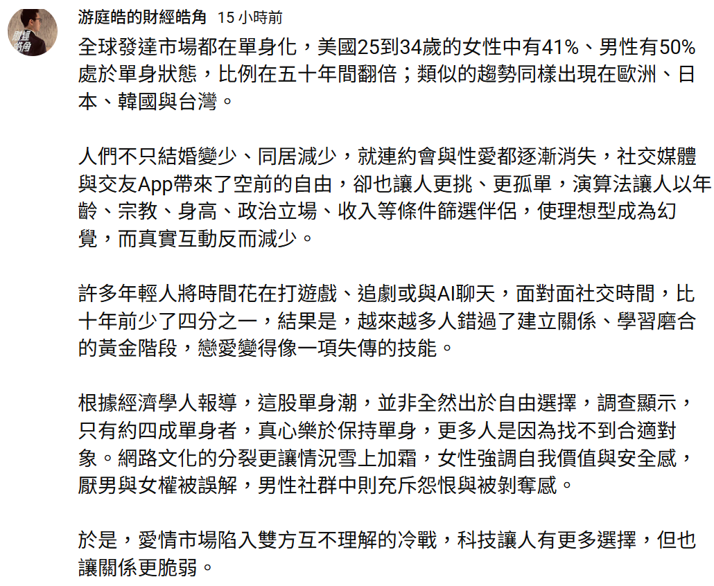 下圖是游庭皓的財經皓角貼文,右圖每個世代用一個顏色代表,未畫的表示該世代還沒到那個歲數。