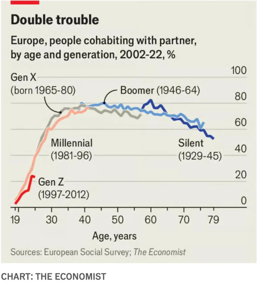- 有偶率屬膨勃世代最高,達到80%左右;千喜世代目前進入結婚高峰期,相比於我的x世代(灰色線),高峰可能還沒到來,顯示晚婚趨向明顯。